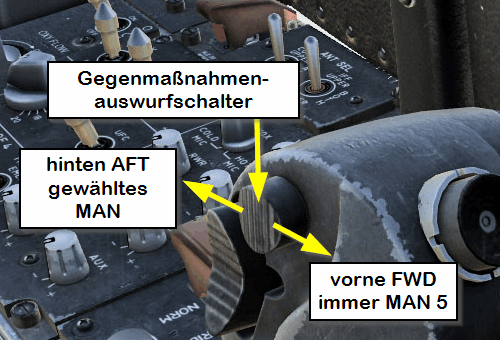 However, if you switch to the MAN 2 program during the approach using STEP and activate it, IR flares are ejected every second. This prevents a Grail or Stinger, for example, from locking to you, or may deflect an IR missile that is already in flight.