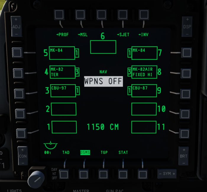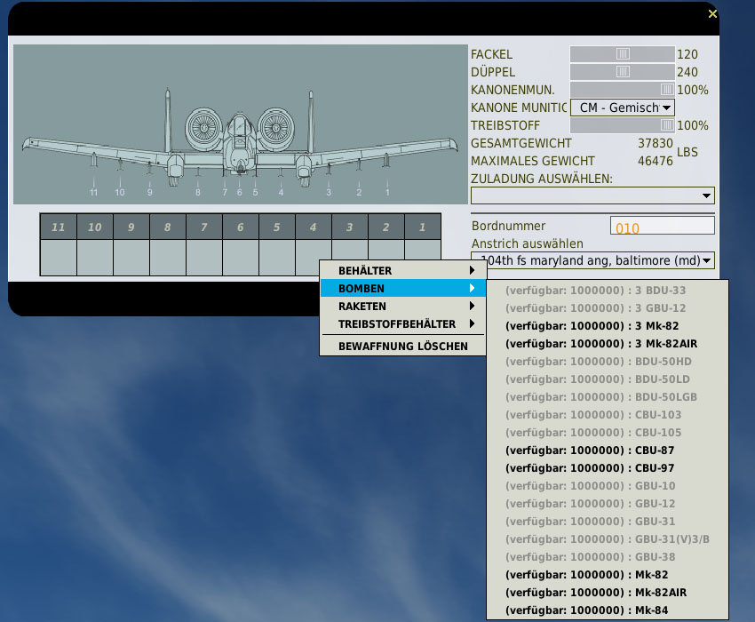 Du kannst verschiedene ungelenkte Bomben an allen Waffenstationen anbringen (siehe auch Bewaffnungsdialog).