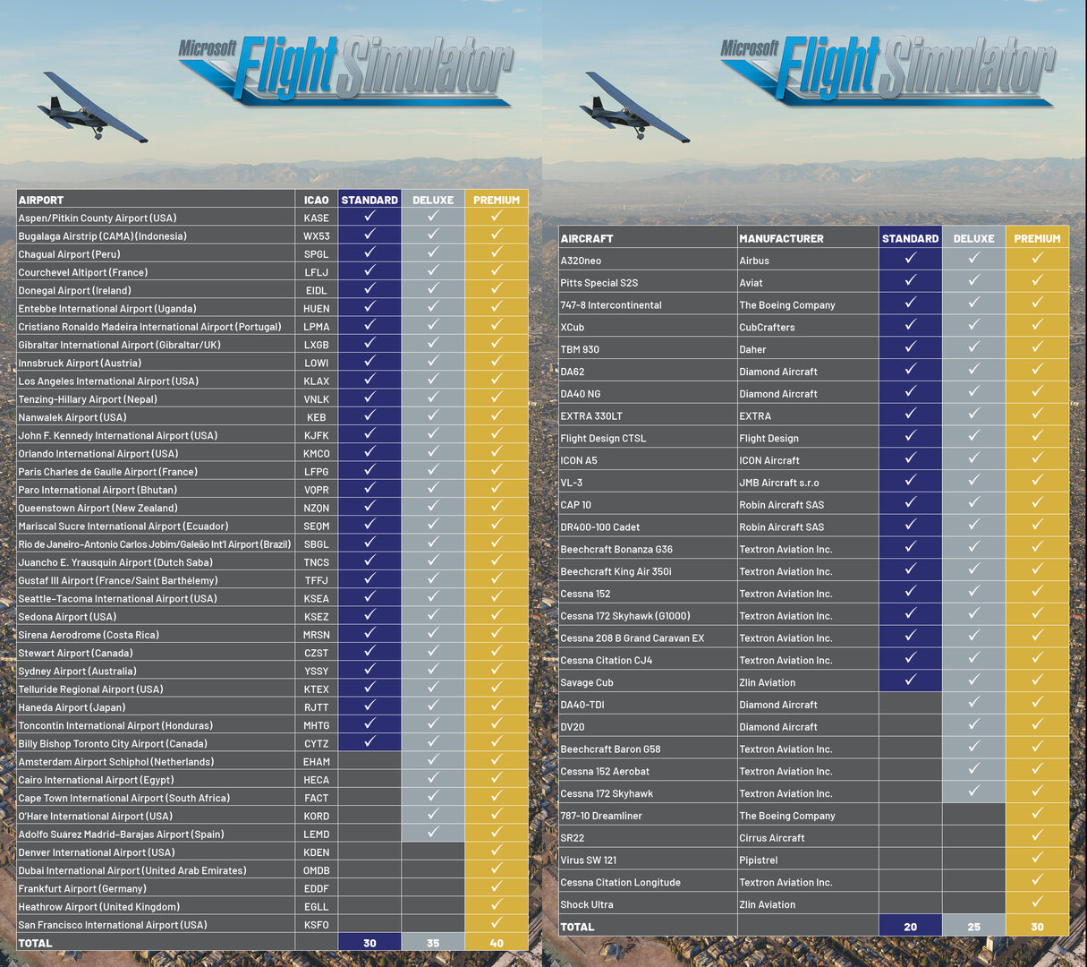 Im folgenden Bild werden die enthaltenen Flugzeuge und Flugplätze der einzelnen Versionen übersichtlich gegenübergestellt: