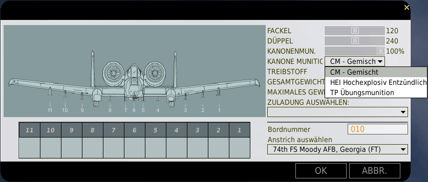 Im Bewaffnungsdialog kannst du die Art der Munition, sowie die Menge in Prozent einstellen.