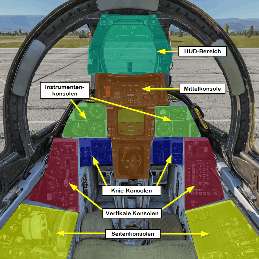 Das Cockpit wird in 11 Bereiche aufgeteilt. Wir haben uns dazu entschlossen, die Bezeichnungen des DCS Handbuchs zu übernehmen, damit du parallel lesen kannst und nicht durcheinanderkommst.