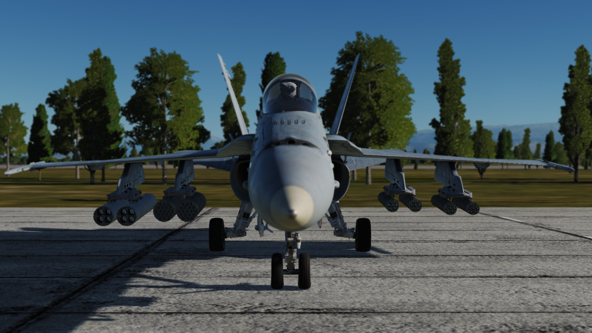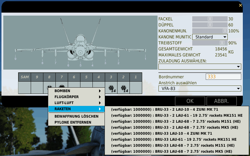 You can attach three different unguided rocket types (ZUNI, Mk 151, Mk 5) to the weapon stations 2, 3, 7 and 8 (see also armament dialog). In addition to the 7 rocket pods, the Mk 151 also has a larger pod with 19 rockets.