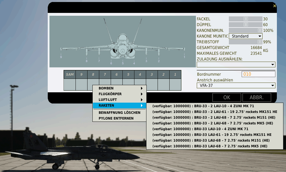 Wenn du eine Single-Player-Mission startest, dann ist die Waffenzuladung normalerweise schon fest vorgegeben. Wenn die Mission am Boden an einer Parkposition startet, kannst du aber immer noch die Bodencrew anfunken und die Bewaffnung ändern lassen.