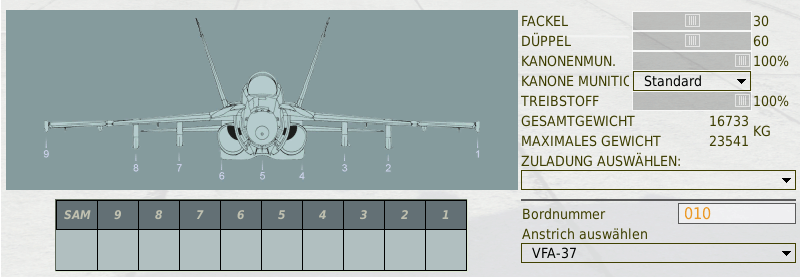 Hier kannst du alle Zuladungen verändern, das Gesamtgewicht prüfen, den Anstich und die Bordnummer ändern.