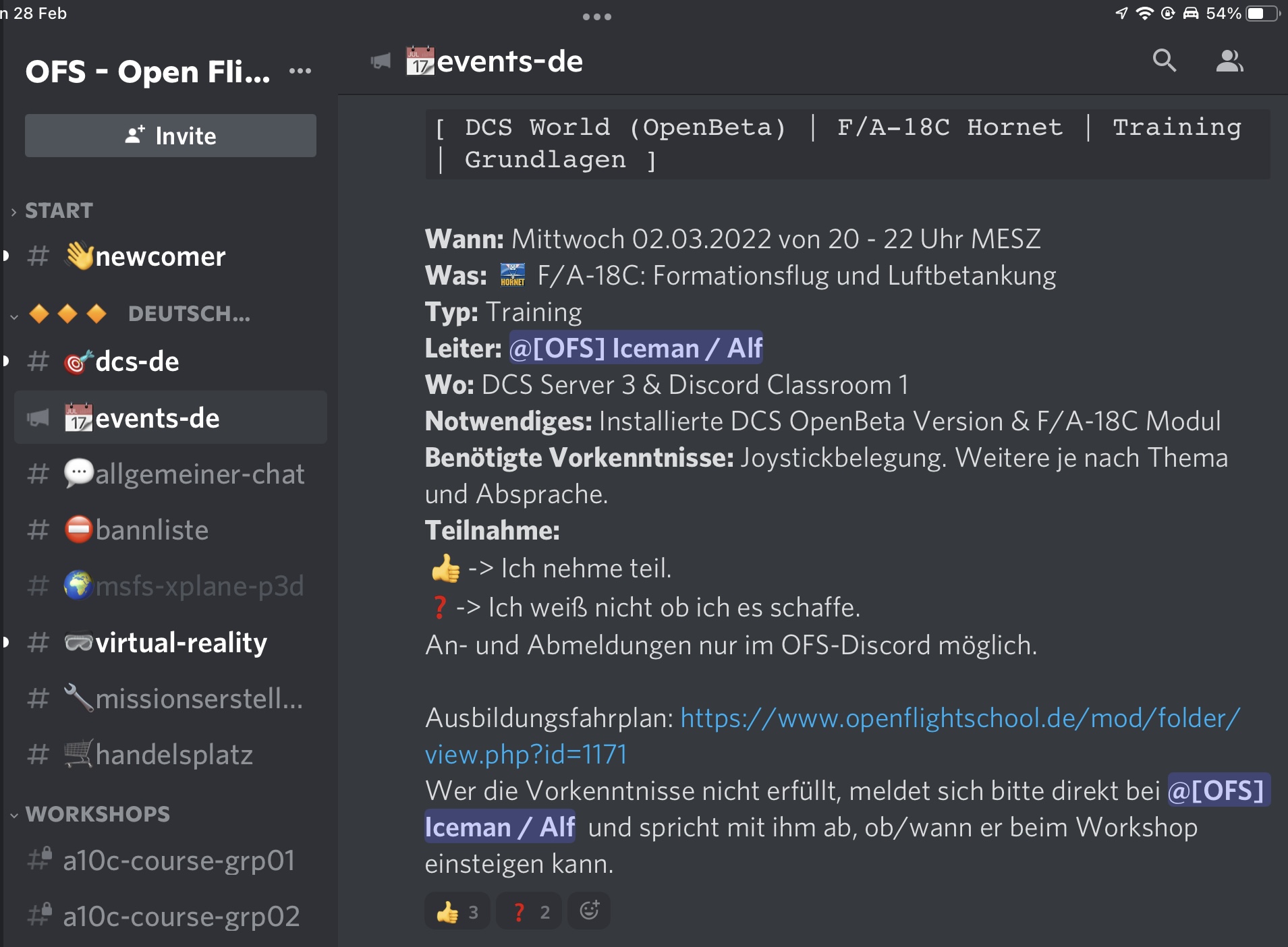 In parallel we have created a Discord server and organized ourselves there. Fortunately, people have come forward who are willing to help beginners with getting started problems. These people are our trainers or tutors. If you are working through an eLearning course, for example, but have a problem or question within certain topics, you can contact us in Discord. We will then try to help and, if necessary, with a flight lesson together.