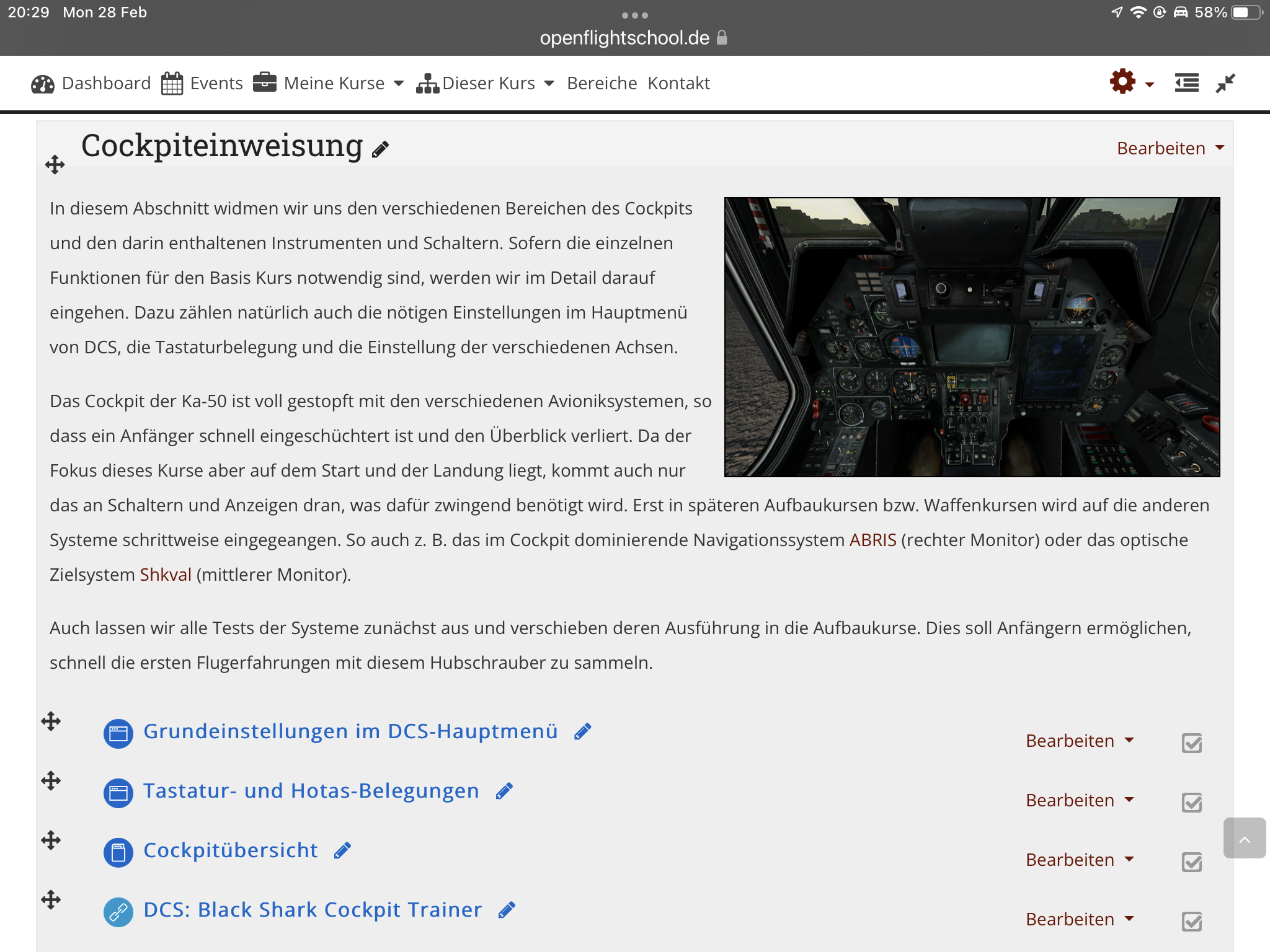 Ein Einstieg mitten drin ist kaum möglich und alle Beteiligten sollten möglichst an allen Abenden teilnehmen. Je nach Komplexität können das auch schon mal 10 - 15 Abende sein. Der Stoff ist oft recht komprimiert und richtet sich eher an Leute, welche schon etwas Erfahrung haben und z. B. nur auf ein neues Flugzeug umsteigen wollen. Aber Anfänger mit Engagement sollten das auch schaffen können.