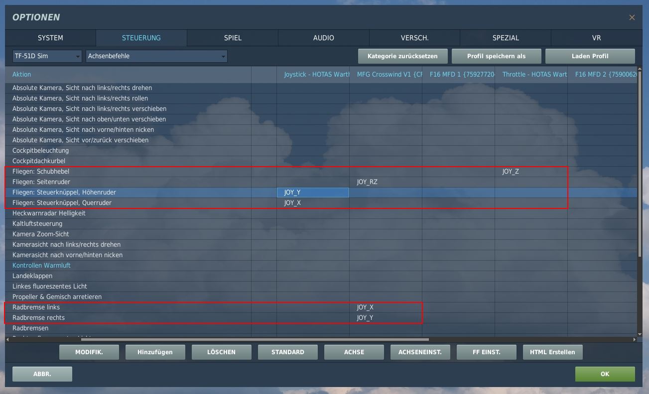 Jetzt solltest du dir am besten auch gleich noch die nötigen Achsen und Tasten belegen, im Gegensatz zu den vorherigen Einstellungen geht das aber auch, wenn du schon in einer Mission drin bist.