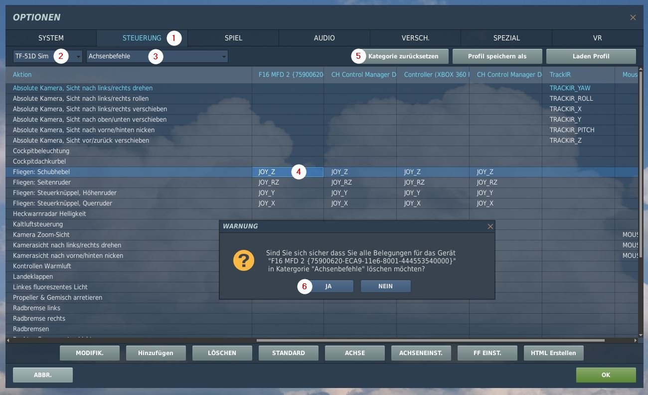 Per Standard weist DCS allen joystickähnlichen Geräten einige Achsen zu. Das ist vom System aber nur geraten und sollte komplett entfernt werden. Dazu klickt man eine Zelle in der Spalte des zu löschenden Gerätes an (4) und wählt oben "Kategorie zurücksetzen" (5) aus. Der Name ist etwas missverständlich gewählt. Du bestätigst mit "Ja" (6) und alle Achsen von diesem Gerät werden gelöscht.