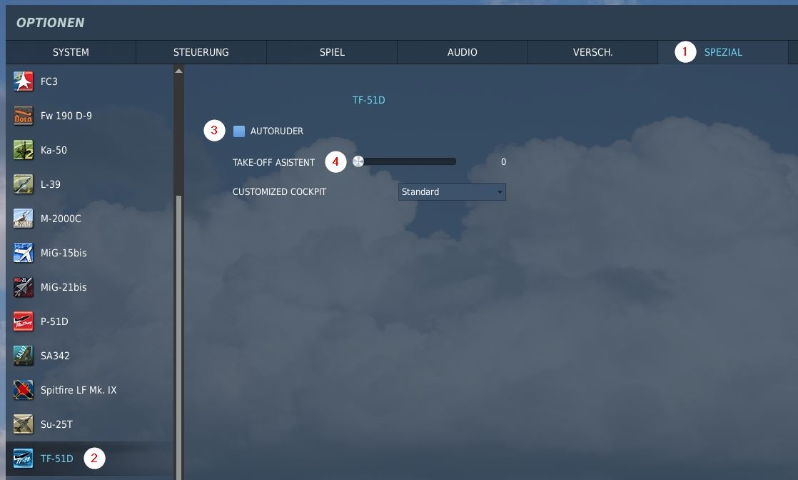 Wenn du Ruderpedale oder einen Twist-Griff hast, dann deaktivierst du die Option AUTORUDER (3). Falls du keine Achse zum Steuern der Ruder hast, aktivierst du die Option. Aber gerade bei den WW2-Flugzeugen ist es ohne Kontrolle der Ruder nur schwer ein Feeling für das Flugzeug zu erhalten!